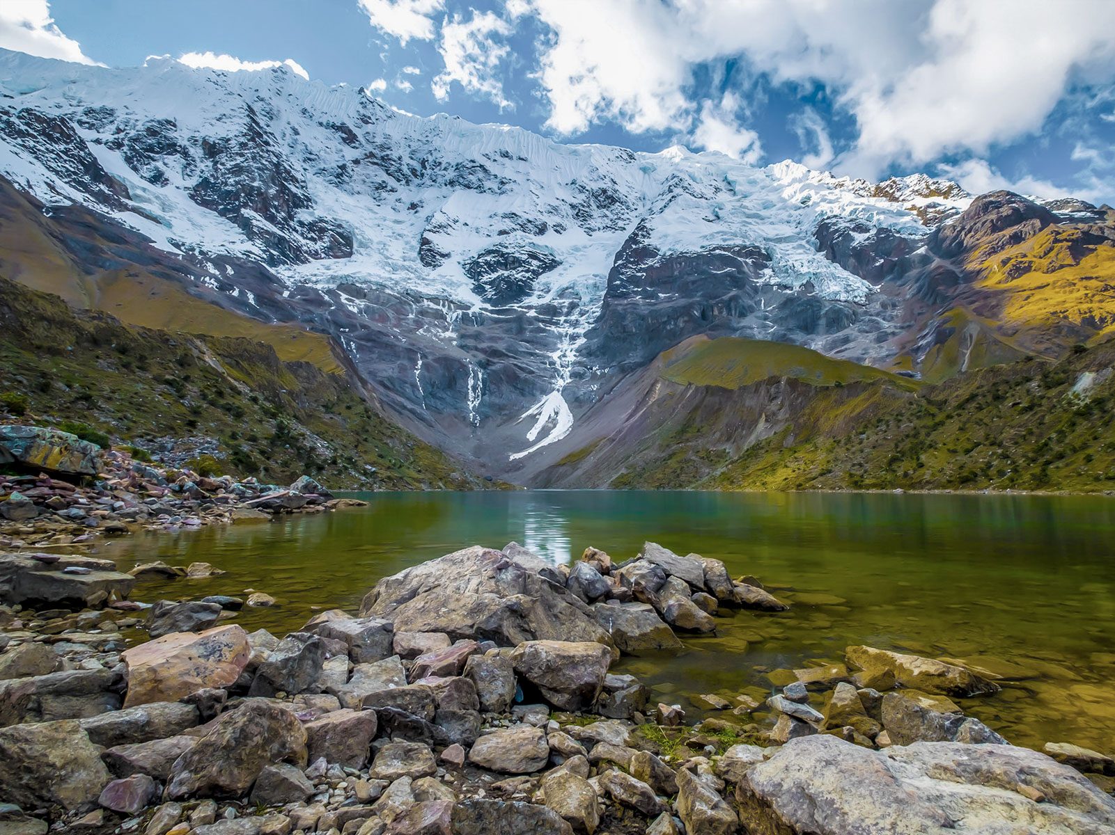 The massive ice formations visible on the slopes of Salkantay Mountain are not static scenery. These glaciers continue to shift, melt, and fracture seasonally. They feed rivers that sustain ecosystems far below, linking the highest peaks to jungle valleys days away.